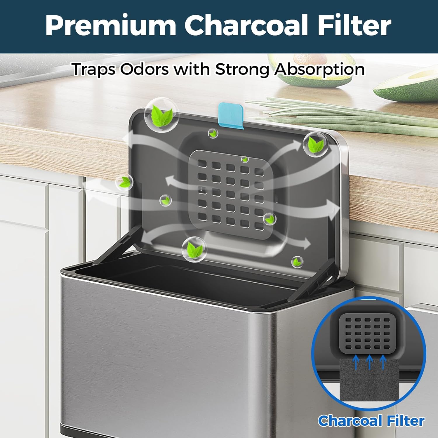 - Odor Absorbing Filter - The activated-charcoal filter included inside this trash can (NOT in other brands) traps and absorbs odors without leaking funky smells. Stainless steel trash can with lid enhances the sealing effect, specifically designed to hide smelling and fruit fly free.
