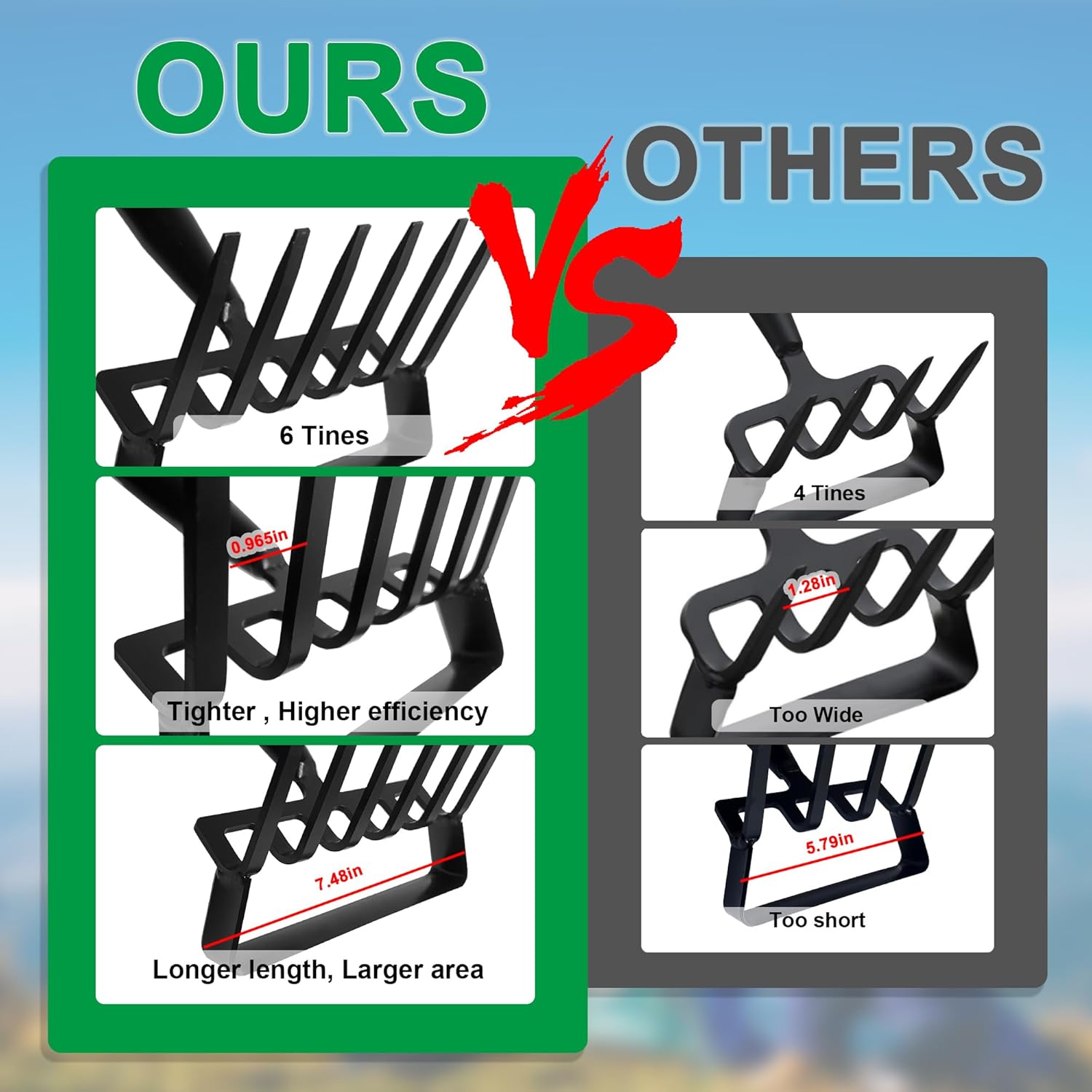 - 【6Tines/8Tines Available】We offer 6 tines and 8 tines metal rake. Compared to 4 tines, the tines spacing is smaller and tighter. It won't fail to remove debris because the tines are too wide apart. The hoe is also longer for more efficient weeding. Garden hoe and rake will easily go through most soil types to dislodge weeds. 2-in-1 yard rake and hula hoe is a great tool for gardening tasks such as weeding, digging, and loosening soil.