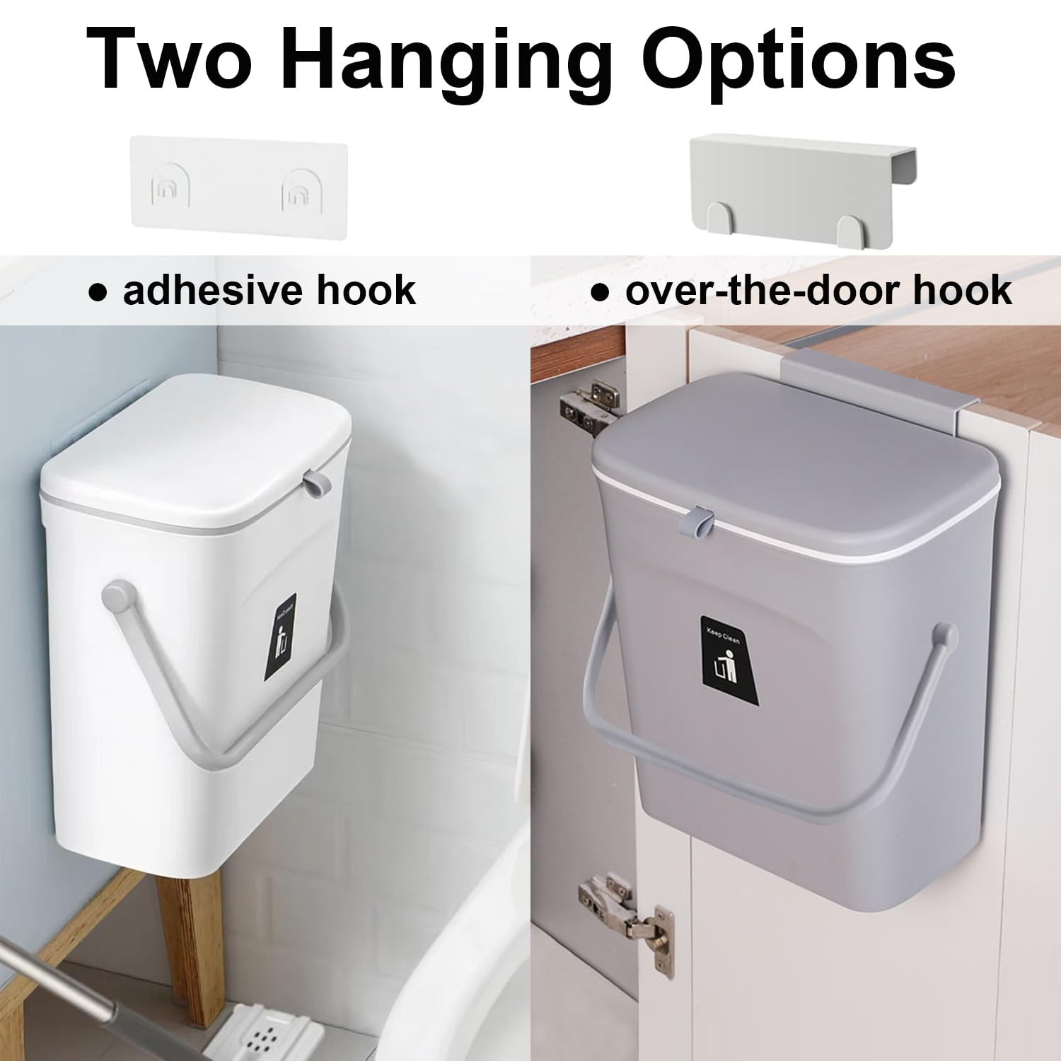 - Wall Mount/Under Sink/Countertop Trash Can: The trash can with lid can be easily hung on kitchen cabinet doors, pantry doors. (The thickness of the door should be less than 0.86 inch) Moreover, this small waste basket can also be wall-mounted to under sinks, cupboard, kitchen wall or bathroom wall with adhesive pad.